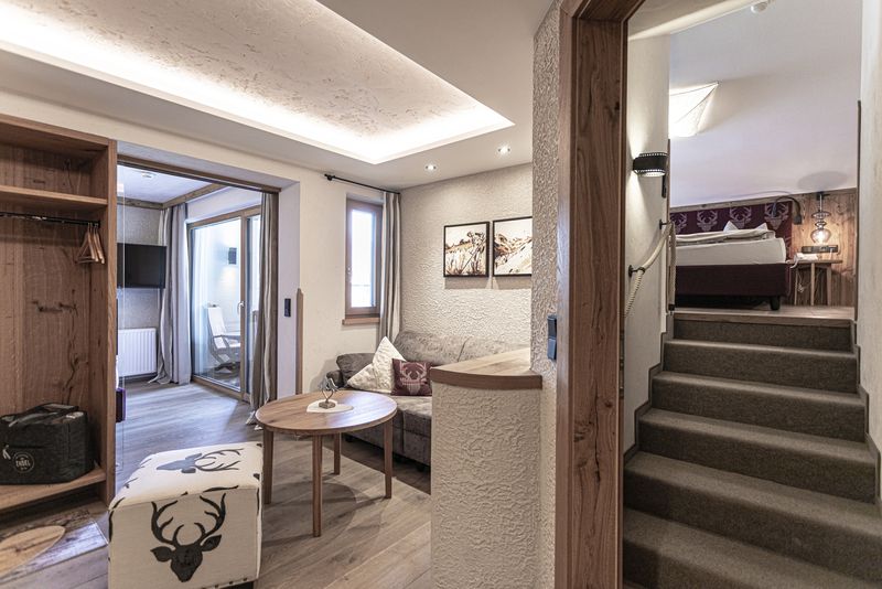 - Holzboden im Wohn- und Schlafzimmer und Teppichboden auf der Treppe