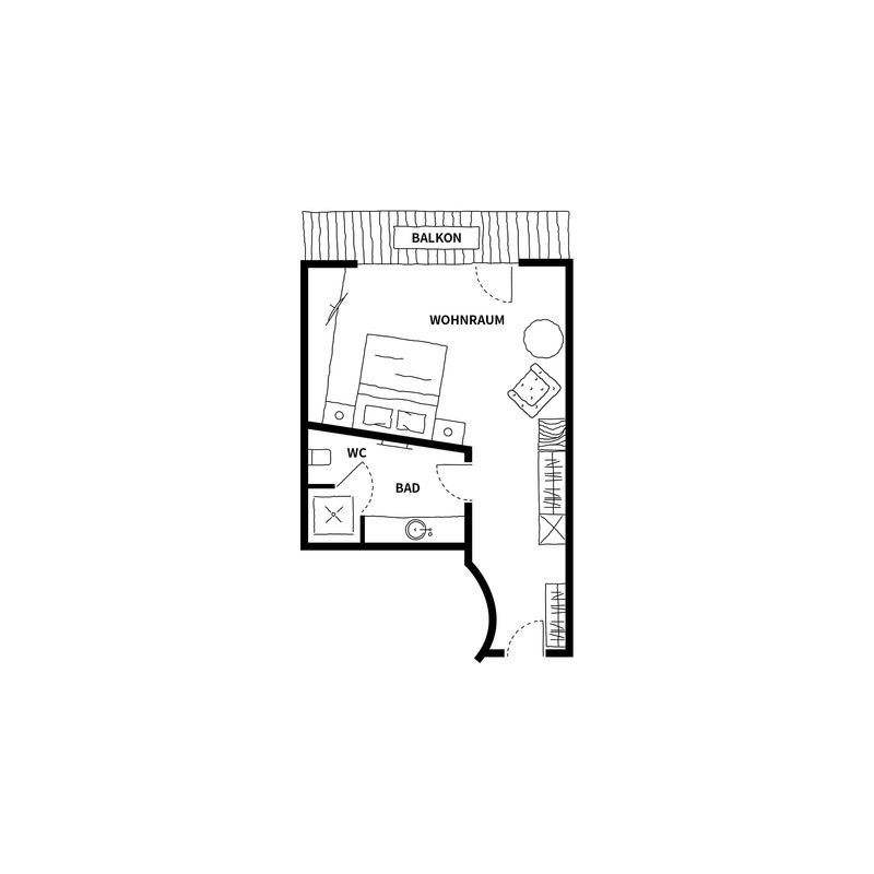 • Kombinierter Wohn-/ Schlafraum mit Einzelbett und Sitzecke